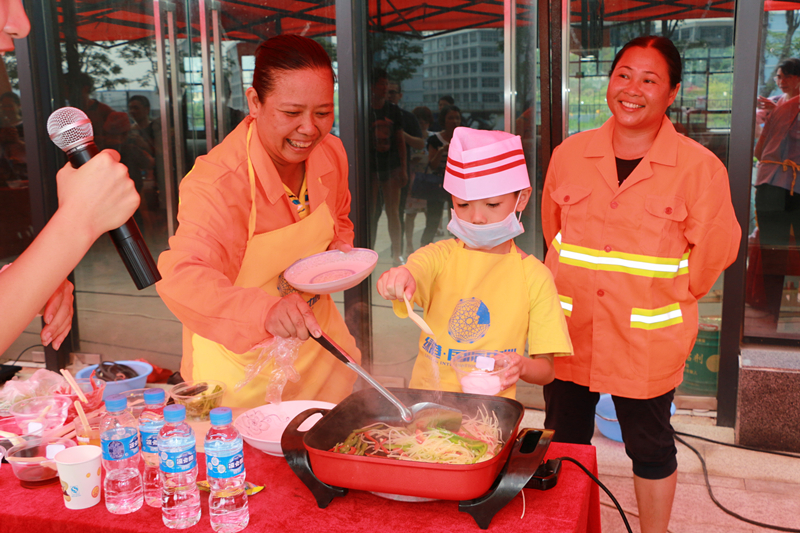 搶答活動(dòng)結(jié)束之后,進(jìn)入“小廚神”廚藝大比拼環(huán)節(jié)。由園林綠化工人、水電維修物業(yè)工人、保潔人員等進(jìn)城務(wù)工人員組成的5組家庭展開了激烈的廚藝大比拼競(jìng)賽??矗N神們?cè)诟改傅闹笇?dǎo)下井井有條地備菜、炒菜、起鍋,忙得不亦樂(lè)乎。各色菜式色香味俱全,充分展現(xiàn)了孩子們“小當(dāng)家”的本領(lǐng)。半小時(shí)后,小廚神們?cè)诖蠹业臒崃艺坡曋型瓿闪吮荣惒似罚瑥N藝大師及現(xiàn)場(chǎng)觀眾根據(jù)完成的速度、菜品、味道等評(píng)出廚藝大賽一等獎(jiǎng)1名,二等獎(jiǎng)2名,三等獎(jiǎng)3名,優(yōu)秀獎(jiǎng)10名。