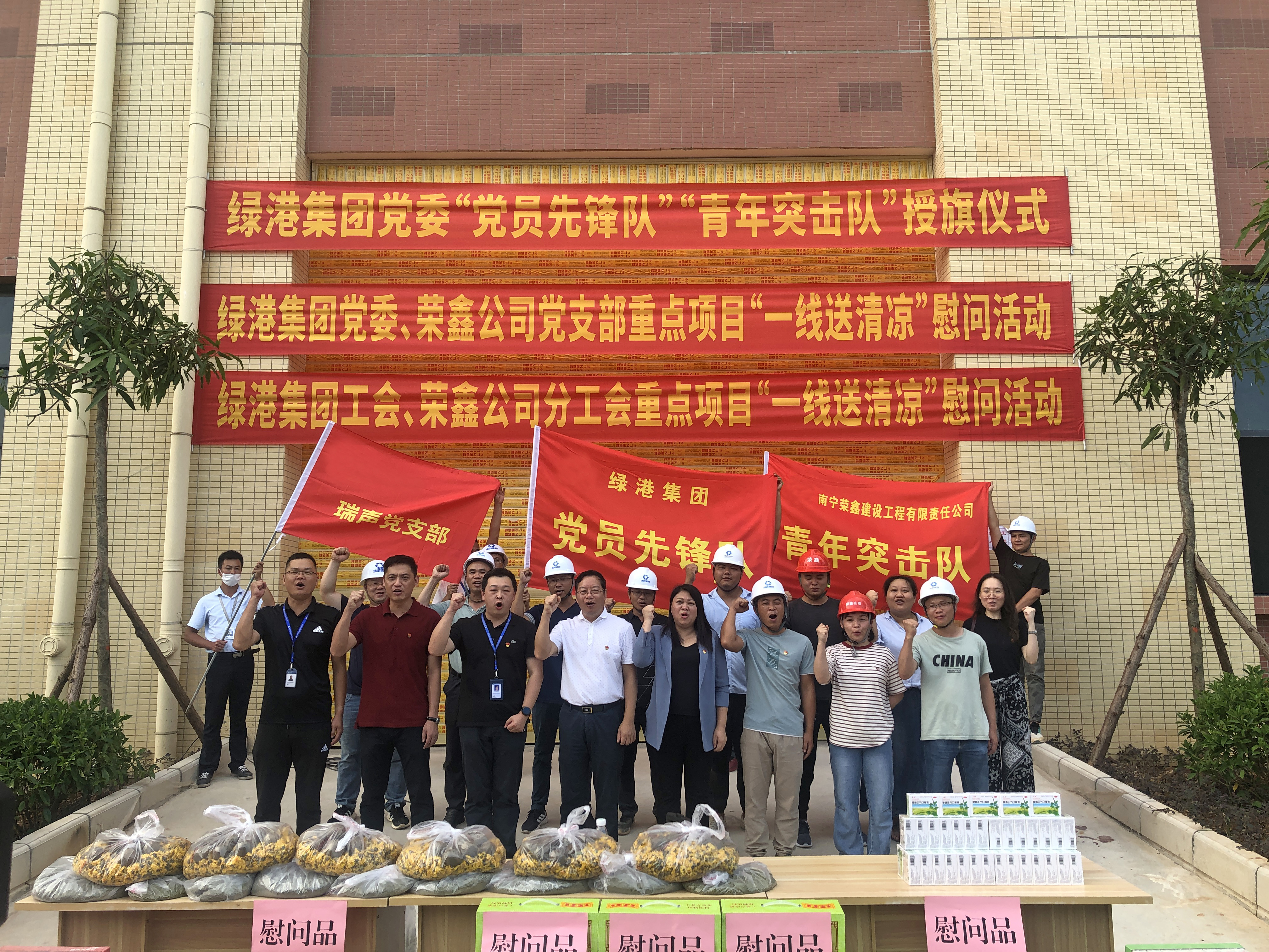 7月14日,由綠港集團(tuán)黨委主辦,榮鑫公司黨支部、榮鑫公司工會承辦的 “黨員先鋒隊(duì)”“青年突擊隊(duì)”授旗暨“一線送清涼”活動(dòng)在瑞聲三期項(xiàng)目現(xiàn)場開展。榮鑫公司黨支部書記、總經(jīng)理李汝埠帶領(lǐng)榮鑫公司領(lǐng)導(dǎo)班子,頂著烈日、迎著熱浪,來到集團(tuán)重點(diǎn)項(xiàng)目——瑞聲科技(南寧)廠房裝修工程(三期)施工現(xiàn)場,親切看望慰問在炎炎夏日中奮戰(zhàn)在項(xiàng)目建設(shè)一線的“黨員先鋒隊(duì)”“青年突擊隊(duì)”隊(duì)員及各施工班組的建設(shè)者,送去了集團(tuán)黨委、榮鑫公司黨支部、榮鑫公司工會的關(guān)心和敬意,為他們加油鼓勁、提振士氣。瑞聲科技(南寧)有限公司副總經(jīng)理李博及項(xiàng)目相關(guān)負(fù)責(zé)人參加活動(dòng)。
