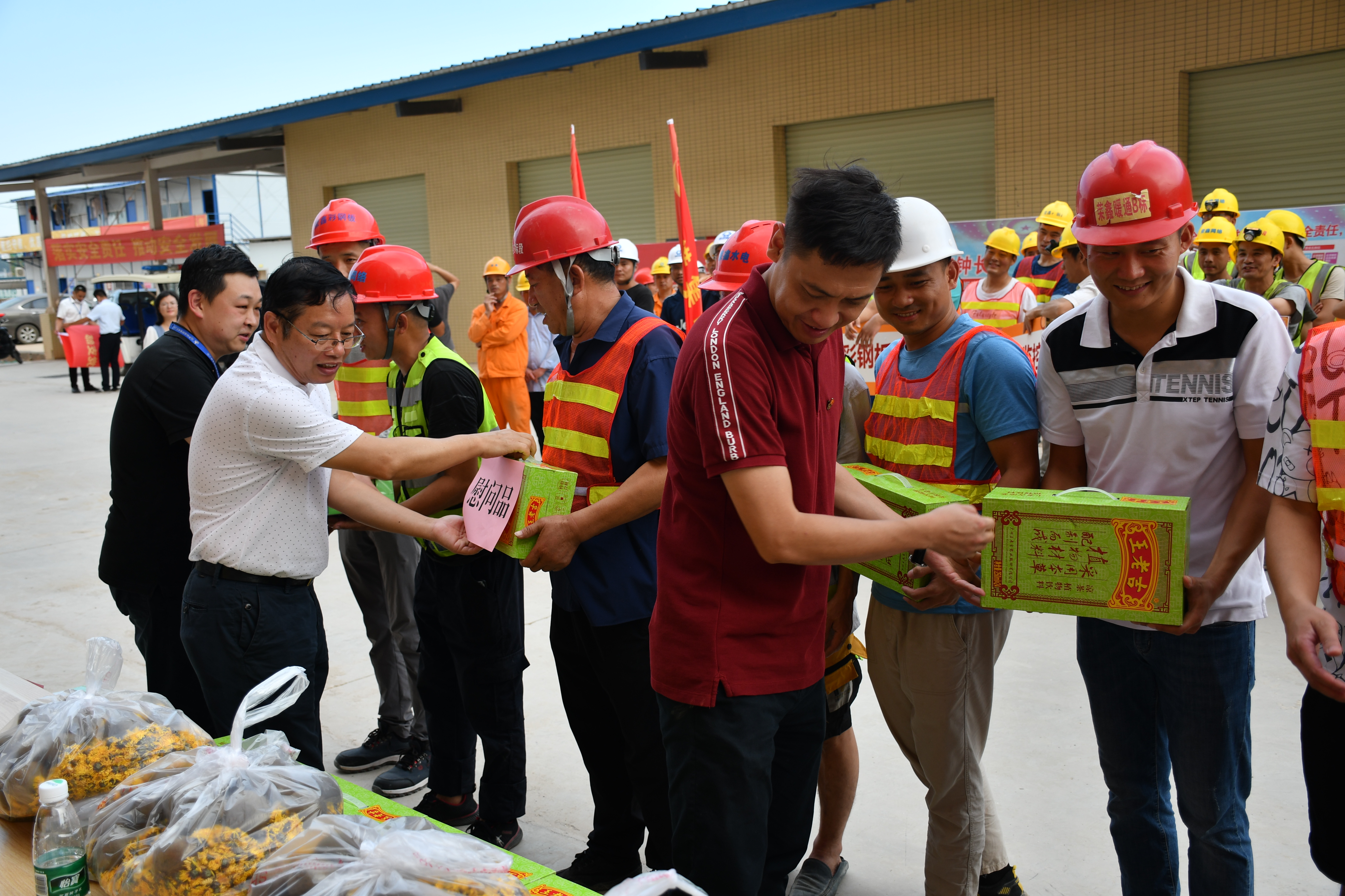最后,榮鑫公司領(lǐng)導(dǎo)班子與瑞聲公司相關(guān)領(lǐng)導(dǎo)一起為一線勞動(dòng)者送上了藿香正氣液、王老吉清涼飲料、西瓜和菊花、羅漢果等清涼慰問品,為沉悶炎熱的工地送去一片清涼。