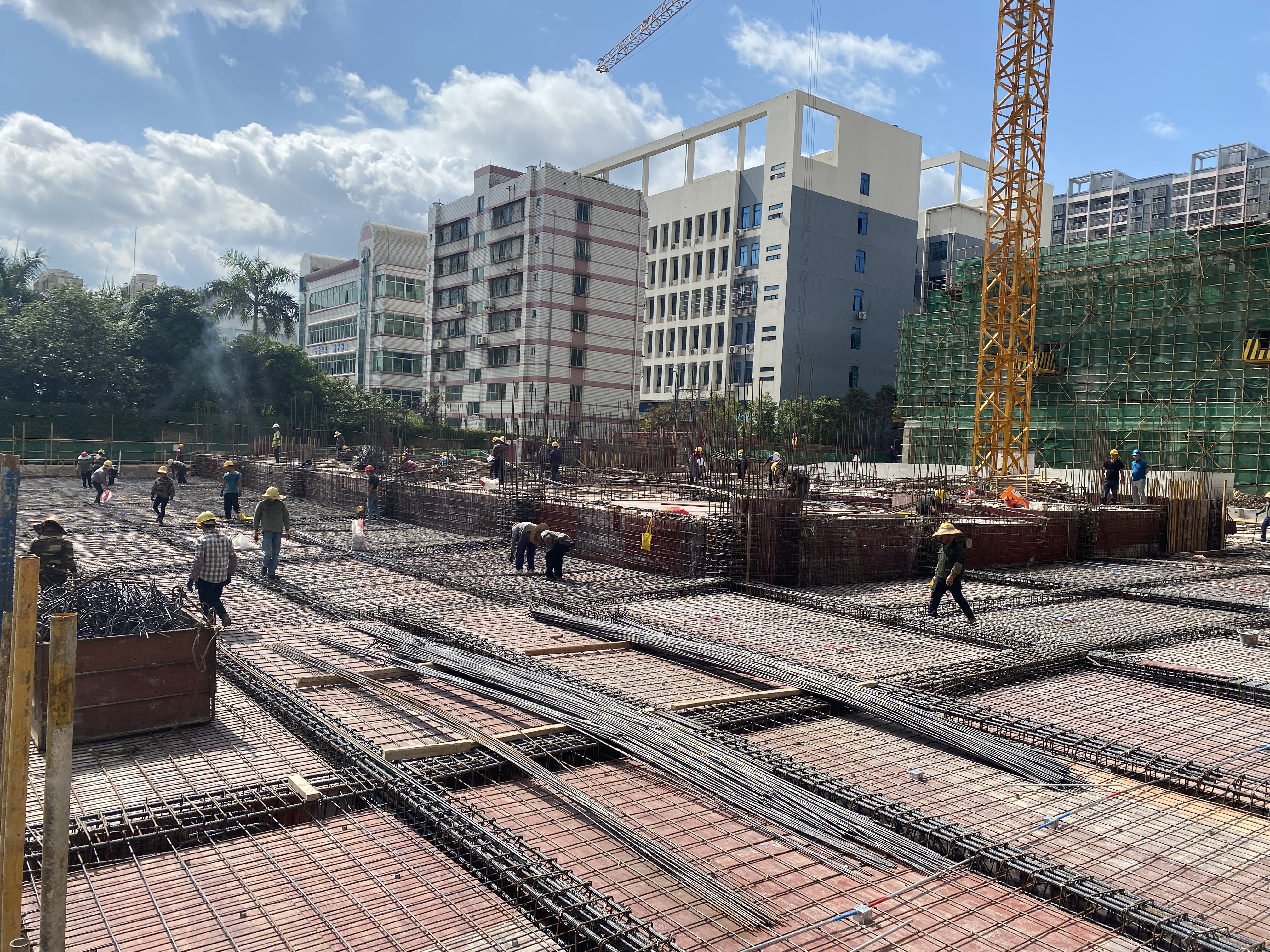 按照施工計劃,項目2#樓為最后施工的一個單體。因工作面有限,加上雨季施工,土方施工遭遇到前所未有的困難,最后幾千立方土,每一方都需要勾機采用二次甚至三次轉(zhuǎn)運的方式才能裝車外運,對預(yù)定工期兌現(xiàn)造成極大影響。為克服困難,自土方開挖以來,綠港集團下屬嘉通公司緊盯預(yù)售節(jié)點為目標(biāo),結(jié)合工程實際,制定了詳細、合理的搶工計劃,并迅速建立一支“強管理、控疫情、重安全、抓質(zhì)量”工作團隊,全員爭分奪秒追上施工“加速列車”,與時間賽跑。同時要求參建單位優(yōu)化每道施工工序搭接,合理穿插施工,實行小雨不停工、大雨制造條件施工、天晴三班制搶工的施工方案。在先后克服了疫情反復(fù)、揚塵噪音管控以及惡劣天氣帶來的各種問題,最終于6月30日取得喜人進展,項目順利完成全部地下室工程的主體施工。