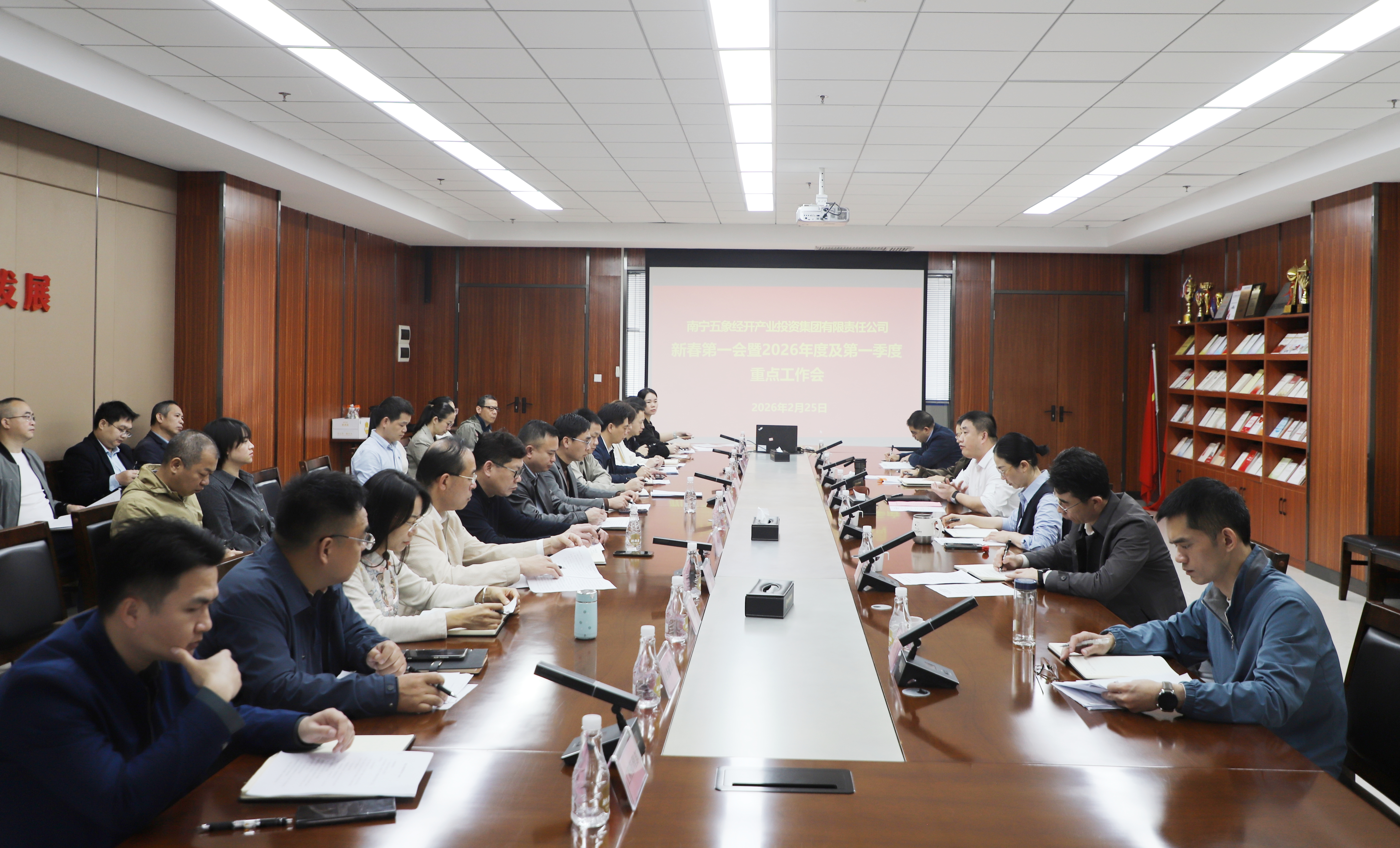一年春作首,萬事干為先。2月26日上午,五象經(jīng)開產(chǎn)投集團(tuán)組織召開2026年新春第一會,深入貫徹落實自治區(qū)、南寧市、五象新區(qū)2026年“新春第一會”會議精神,系統(tǒng)分析集團(tuán)公司發(fā)展現(xiàn)狀,研究部署2026年及一季度重點工作,動員全集團(tuán)上下統(tǒng)一思想,明確工作目標(biāo),全力以赴拼經(jīng)濟(jì)、抓落實、促發(fā)展,全面化解歷史矛盾,全力促進(jìn)安全穩(wěn)定,奮力爭取一季度開門紅,為全年破局突圍筑牢基礎(chǔ)。集團(tuán)黨委書記、董事長羅祥濤主持會議并講話,集團(tuán)領(lǐng)導(dǎo)班子、中層副職以上管理干部及各子公司班子成員參加會議。